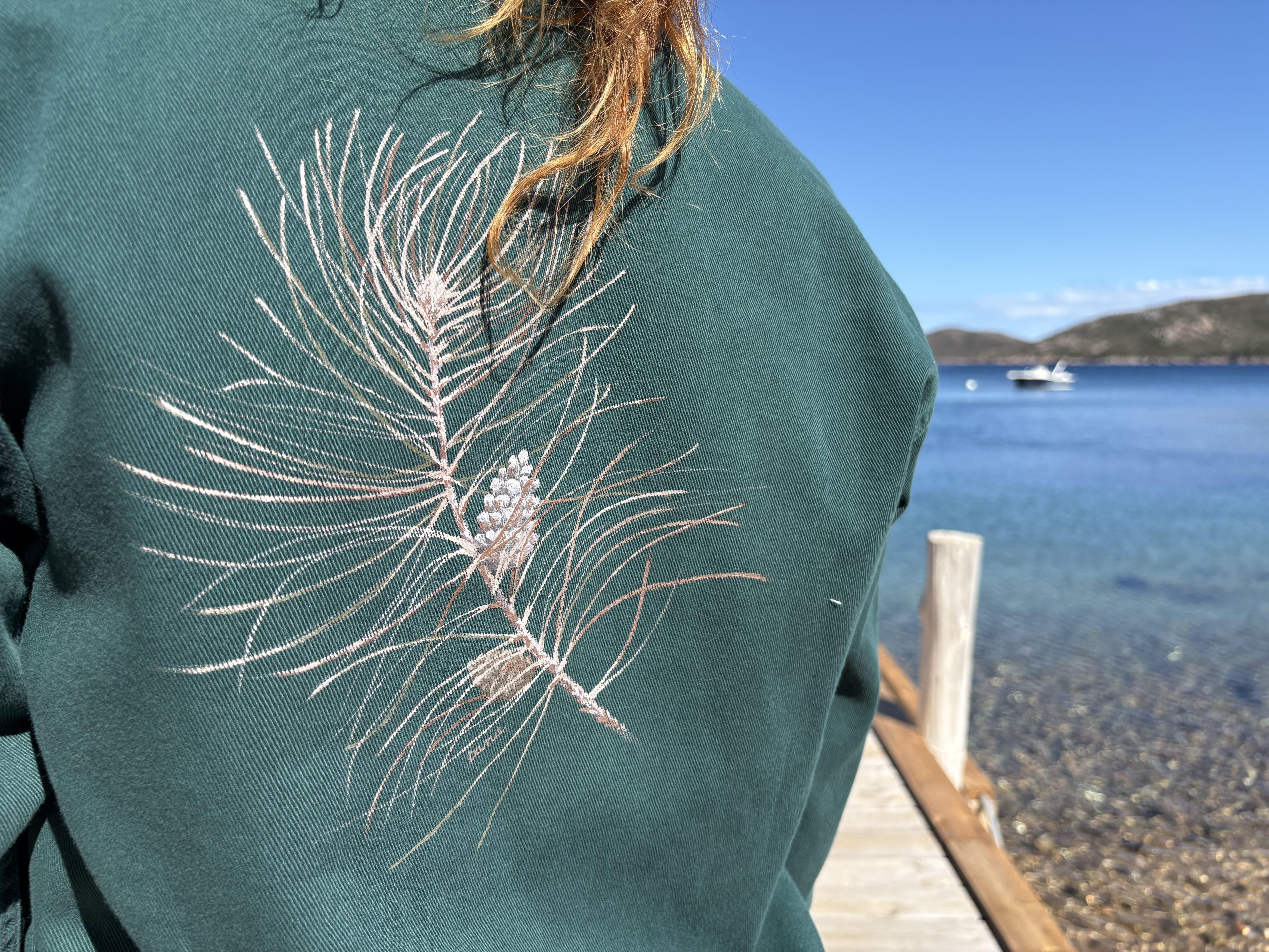 Au dos de cette veste en coton, l’artiste Dana a laissé parler ses rêves, inspirés par les éléments naturels emblématiques de la région de Bonifacio.