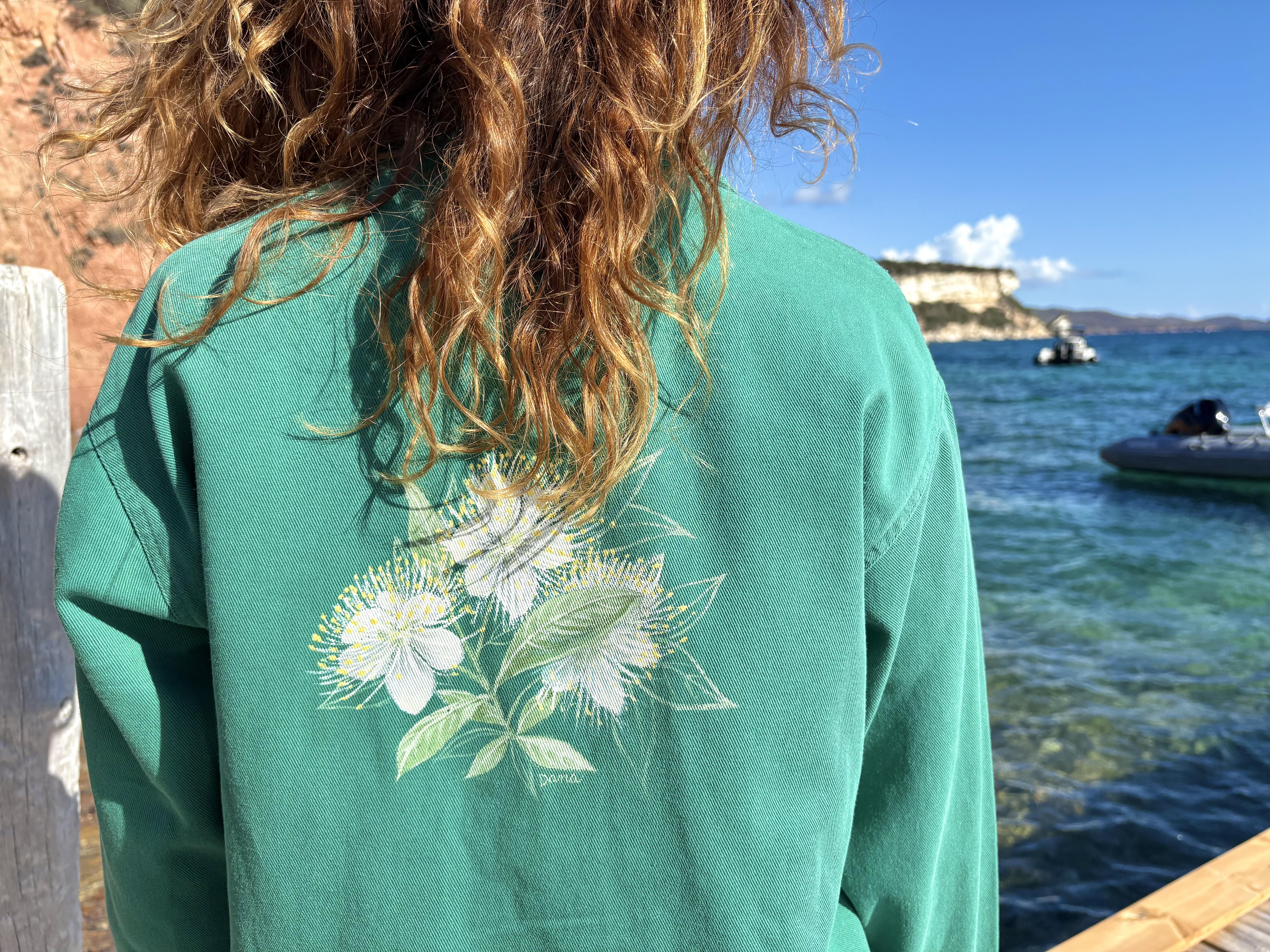 Au dos de cette veste en coton, l’artiste Dana a laissé parler ses rêves, inspirés par les éléments naturels emblématiques de la région de Bonifacio.